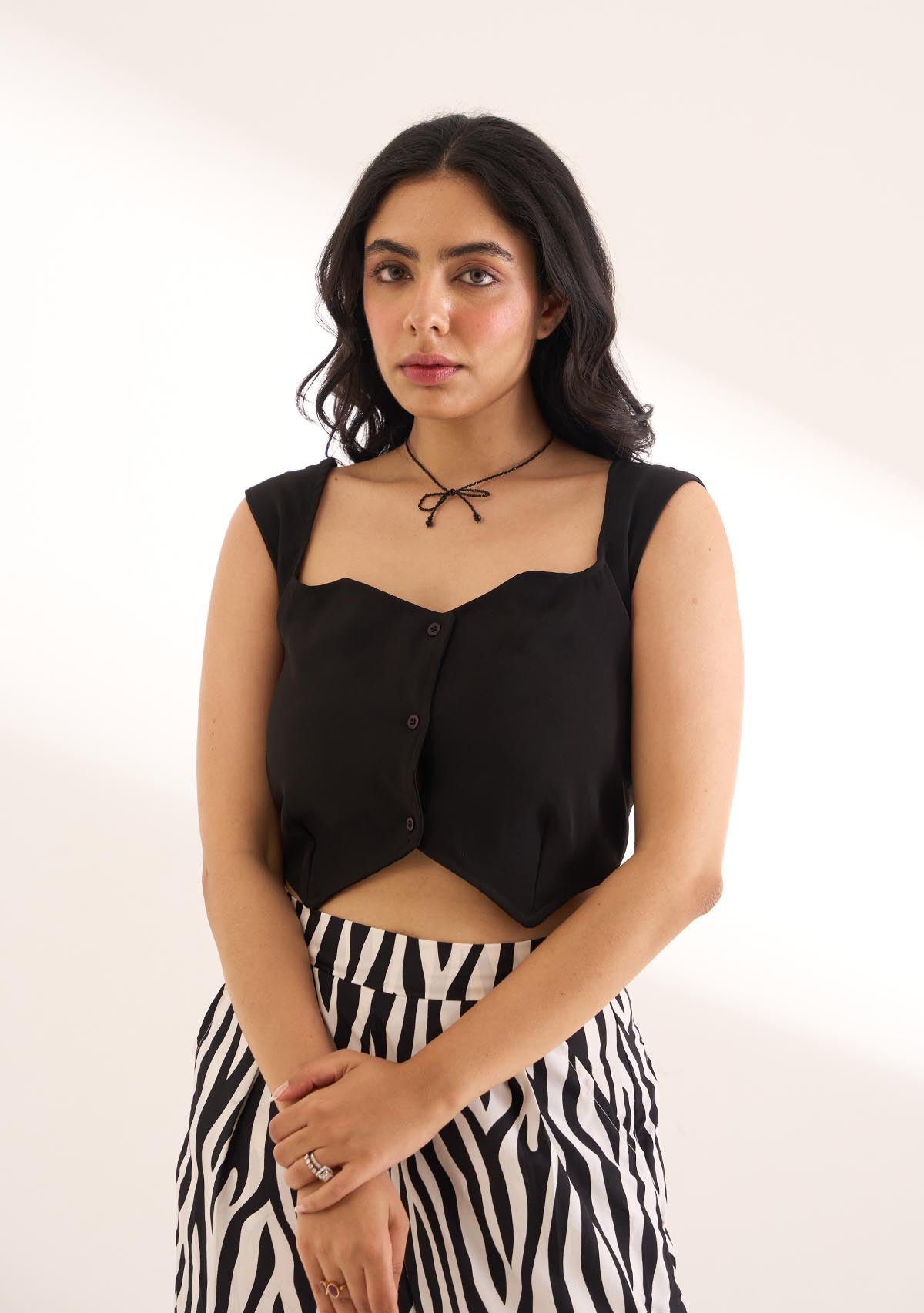 The Fino set is a fresh take on structured and tailored fits for the summer. Featuring a premium crepe waistcoat with a pointed hem and curved neckline, the wide-leg zebra pants contrast the structure with an added element of fun. Add shiny earrings, a clutch and black heels for a night out.